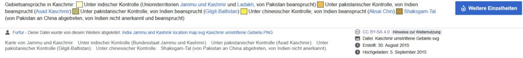 Der Kaschmir-Konflikt ist ein Konflikt um die im Himalayagebiet Region Kaschmir zwischen Indien, Pakistan und der Volksrepublik China. wikipedia.org Kaschmir-Konflikt